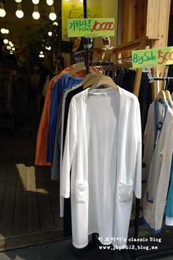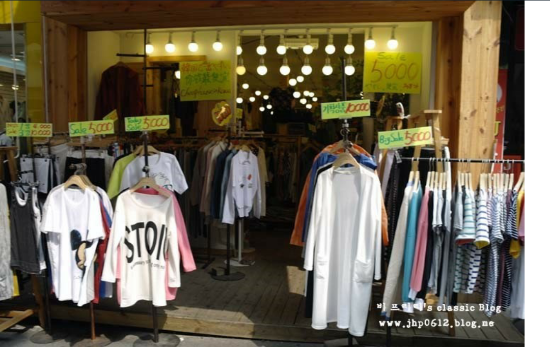 이곳에서는 다양한 옷을 판매하고 있다. 옷의 종류로는 셔츠, 청남방, 맨투맨티, 치마레깅스,멜빵치마, 치마, 바지, 원피스, 니트류, 야상 등이 있다. 대부분의 옷의 가격은 5천원에서 만원 사이이며 야상의 경우는 2만원~3만원이다. 기본나시의 경우 1벌에는 4000원이지만 3벌을 사면 만원이다. 원단이 좋아서 촉감이 부드럽고 바느질도 잘되어있다.